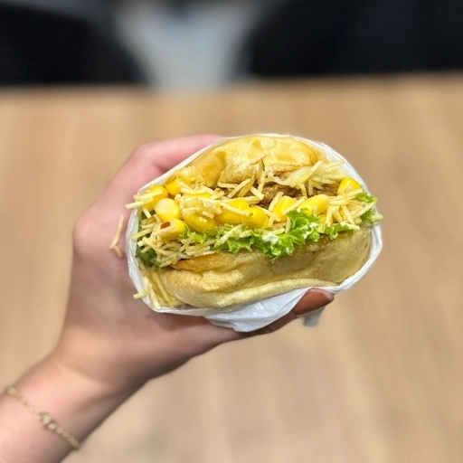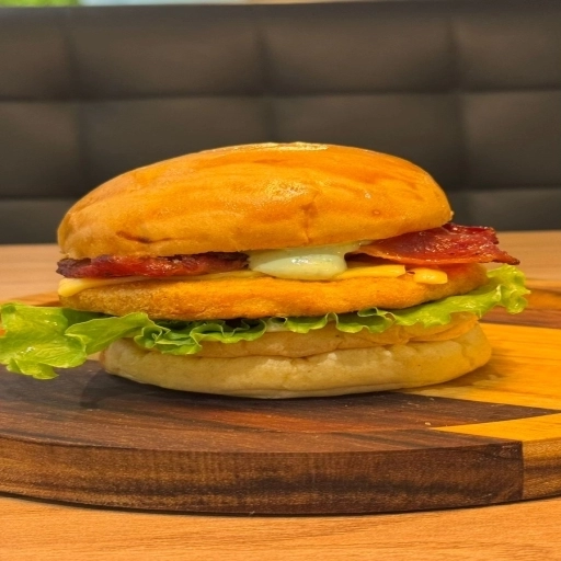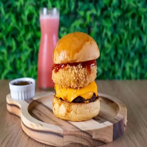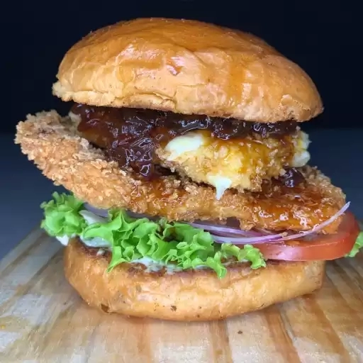 Pao de brioche, frango empanado, queijo empanado, cebola caramelizada, alface, tomate, cebola roxa.