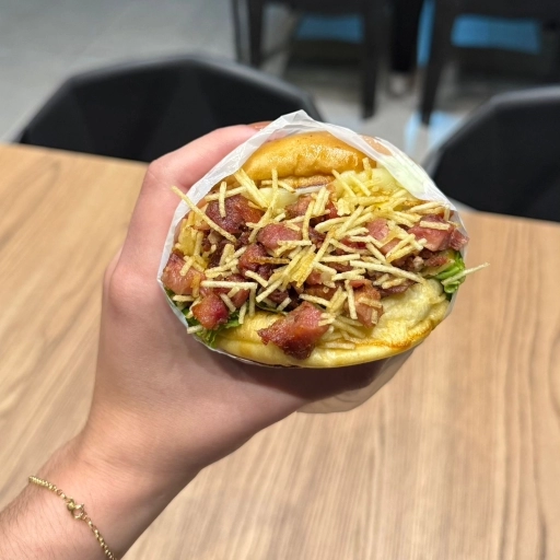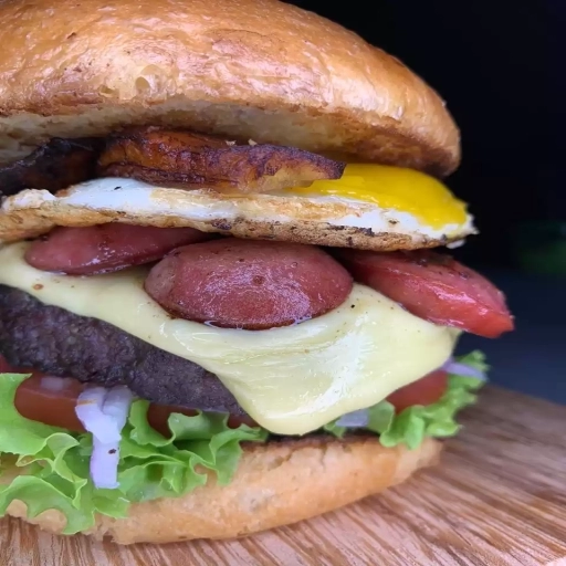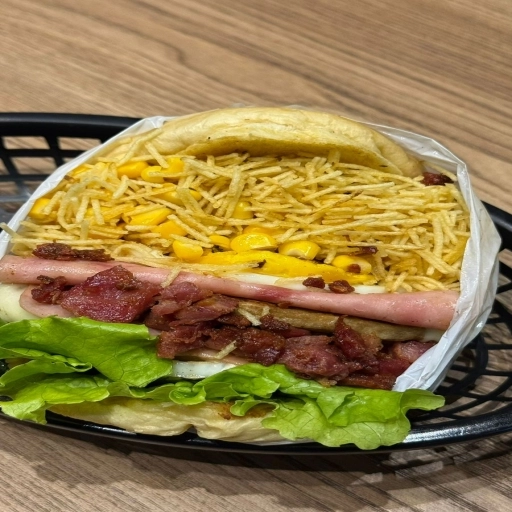 Pão, 2 carnes, 2 mussarelas, 2 presuntos, 2 ovos, dobro de bacon, alface, tomate, milho, batata palha