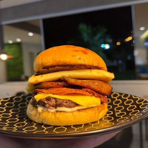 PÃO DE BRIOCHE, BURGER 150G, QUEIJO PRATO, QUEIJO COALHO SELADO, BANANA FRITA, BACON CROCANTE E MEL.