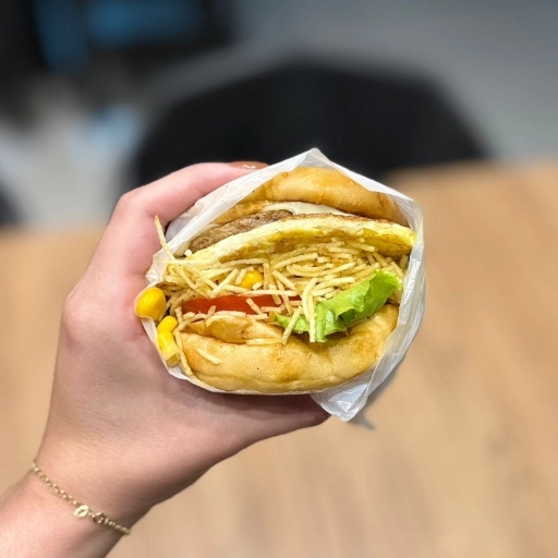 Pão, carne, mussarela, alface, tomate, milho, batata palha