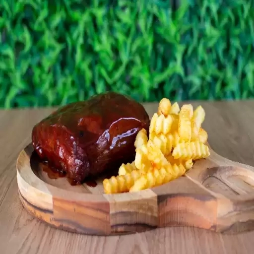 Costela suina defumada acompanhada de batata frita e molho especial.